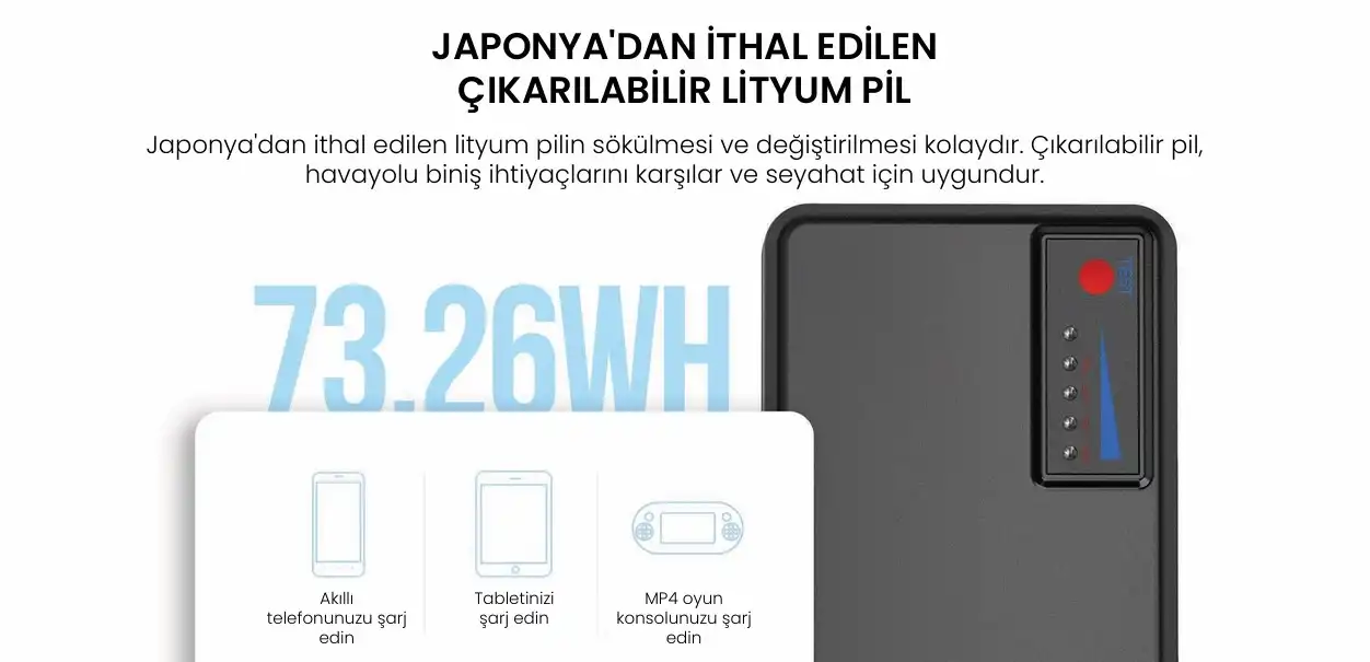 batarya, UN, TSA, FAA ve IATA'nın 100Wh sınırına uygun olup, güvenli bir şekilde çıkarılabilir.